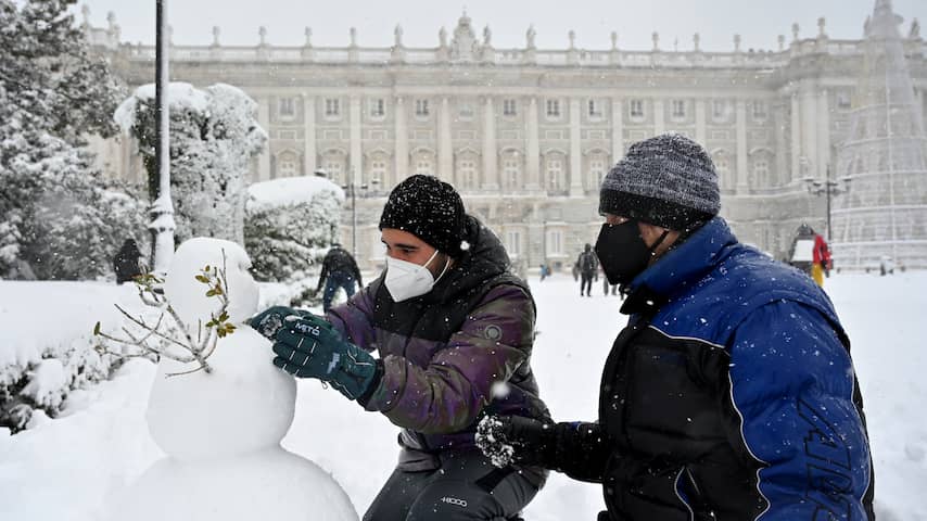 Spanjaarden maken sneeuwpoppen na de storm. | Beeld: ANP
