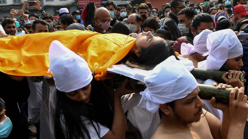 Betogers droegen een jonge vrouw op een draagstoel mee; zij symboliseerde de slachtoffers van geweld tegen vrouwen in Nepal. | Beeld: ANP