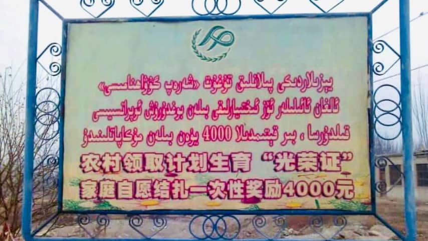 Op dit bord wordt de bevolking ertoe opgeroepen zich te laten steriliseren. | Beeld: Qelbinur SedikOproep om naar de vrouwenkliniek te komen