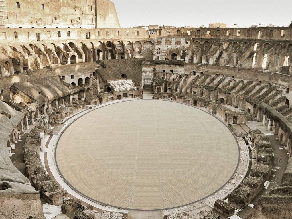 Het Colosseum, gebouwd op initiatief van de Romeinse keizer Vespasianus en ingewijd door diens zoon en opvolger Titus, heeft momenteel geen arenavloer. Die werd in de negentiende eeuw verwijderd door archeologen, waarmee het ondergrondse gangenstelsel waar gladiatoren en wilde dieren op hun beurt wachtten bloot kwam te liggen.