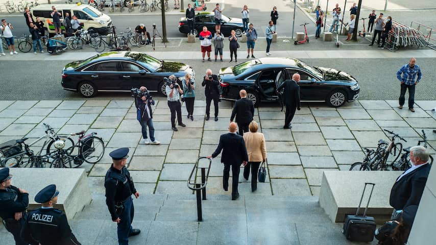 Merkel verlaat het Duitse parlementsgebouw na de laatste zitting voor de verkiezingen op 7 september. Te zien is hoe ze wordt begeleid door haar lijfwachten. | Beeld: AFP