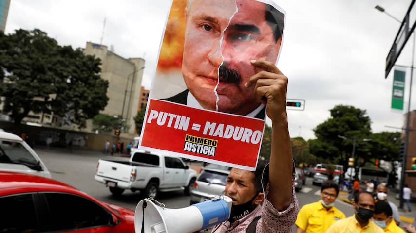 Ook in Venezuela is geprotesteerd tegen de Russische invasie van Oekraïne. Deze demonstrant schreef op zijn protestbord: "Poetin = Maduro. Gerechtigheid eerst." | Beeld: Reuters