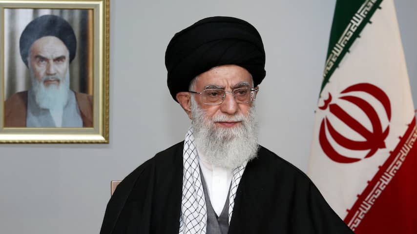 Ali Khamenei, de huidige hoogste leider van Iran. Achter hem hangt een portret van zijn voorganger, Ruhollah Khomeini. | Beeld: AFP