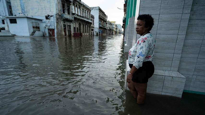 Een vrouw beziet de ondergelopen straten in de Cubaanse hoofdstad Havana. | Beeld: AFP