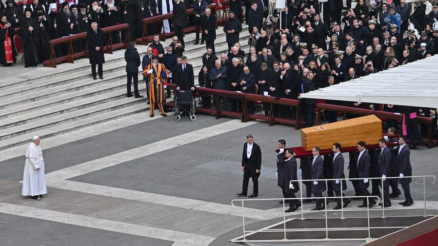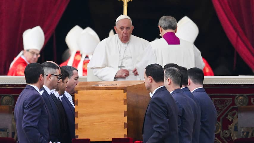 De kist met daarin paus Benedictus maakte een tocht richting het altaar. Onder de aanwezigen zijn de Duitse president Frank-Walter Steinmeier, zijn Italiaanse collega Sergio Mattarella en de Italiaanse premier Giorgia Meloni. De Nederlandse regering wordt vertegenwoordigd door de ambassadeur in Vaticaanstad. | Beeld: AFP