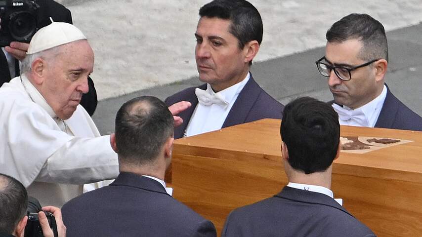 Paus Franciscus neemt afscheid van paus Benedictus. De kist wordt onder luid applaus naar de Sint-Pietersbasiliek gedragen, waar Benedictus zal worden bijgezet. Hij komt op eigen verzoek te liggen in de crypte onder de Sint-Pieter, waar zijn voorganger Johannes Paulus II ook begraven lag. Zijn lichaam is in 2011 verplaatst naar een kapel in de basiliek. | Beeld: AFP