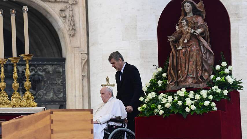 Paus Franciscus werd in een rolstoel naar het podium gereden. Hij heeft een aandoening aan een knie. | Beeld: AFP