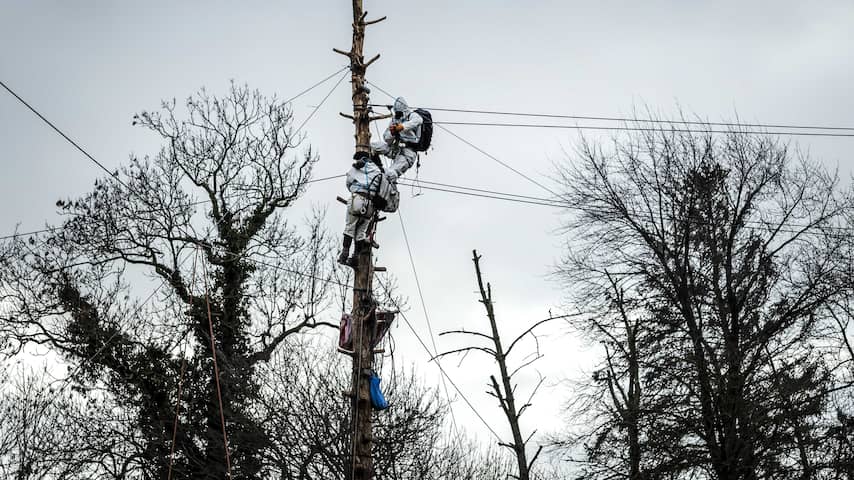 De politie haalt boomhutten in het dorp naar beneden. | Beeld: AFPPolitie sneed kabels door om activisten op palen te verwijderen