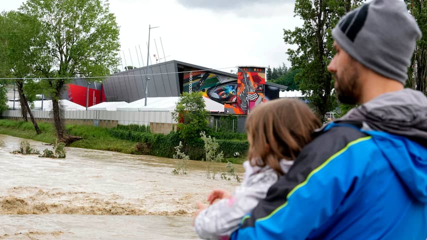 Vader en dochter kijken naar een hoog staande rivier. Op de achtergrond zie je het circuit van Imola. Hier zou aankomend weekend de inmiddels afgelaste GP van Emilia-Romagna plaatsvinden. Het is nog niet bekend wanneer Max Verstappen en consorten hier wel gaan racen. | Beeld: AFP