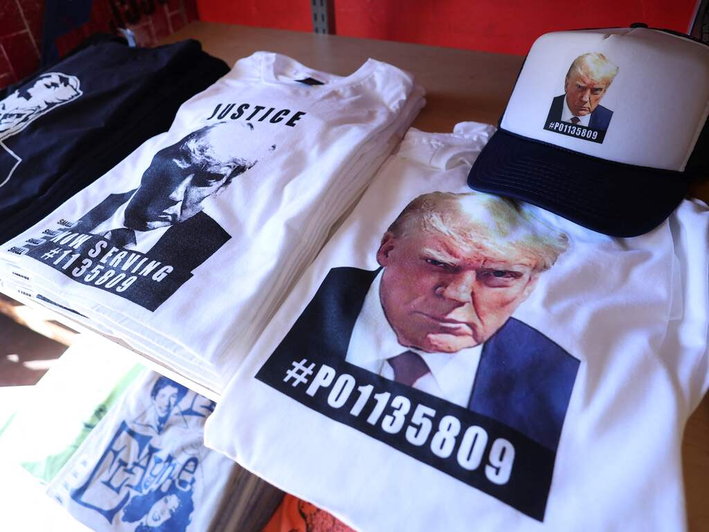 Naast donaties probeert Trump ook geld te verdienen met de verkoop van spullen: van koffiemokken en bumperstickers tot posters en T-shirts. Op zijn campagnesite kunnen aanhangers tal van producten met daarop Trumps mugshot kopen. Bij de foto staat de tekst: "Geef je nooit over."