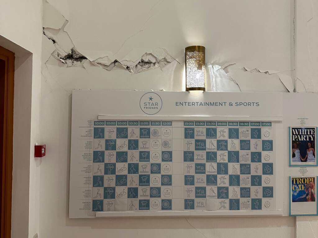 NU.nl-lezer Peter Rus verblijft in Marrakesh en stuurde deze foto van het hotel waar hij verbleef. De aardbeving veroorzaakte flinke scheuren in de muren van het gebouw. | Beeld: NU.nl/Peter Rus