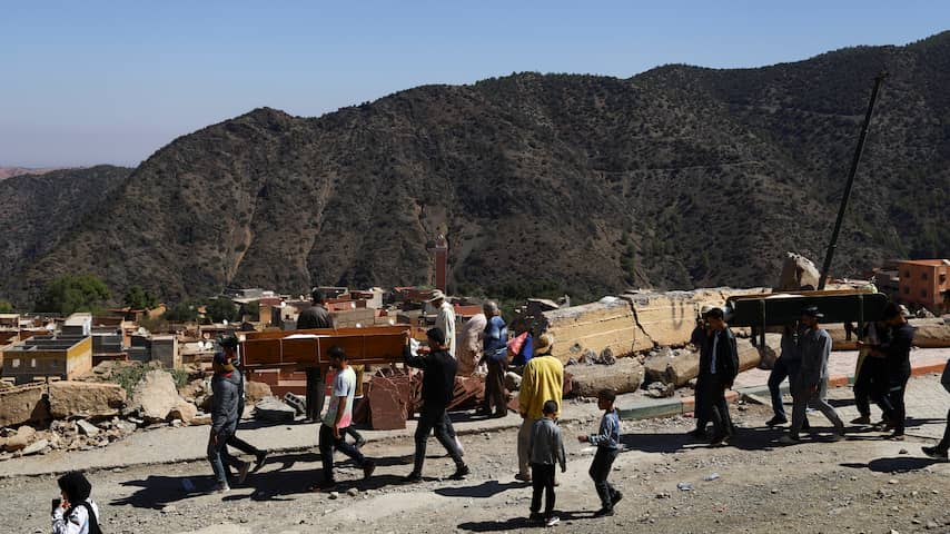 Maar heel vaak stuiten vrijwilligers op de dood. In Moulay Brahim, vlak bij het epicentrum van de beving, worden slachtoffers geëerd tijdens een begrafenis. | Beeld: Reuters