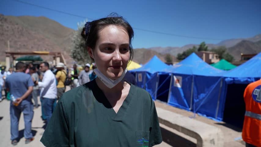 Jule studeert geneeskunde en was net begonnen aan een stage van een maand in Casablanca toen de ramp zich voltrok. Tijdens het bezoek van NU.nl moet ze zich meerdere keren lenen - met duidelijke tegenzin - voor selfies met mannen die op de foto willen met de Duitse in haar groene operatiekleding.