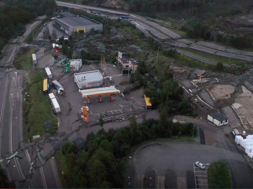 De aardverschuiving vond in de nacht van vrijdag op zaterdag plaats bij het plaatsje Stenungsund, op 50 kilometer afstand van Göteborg. Op beelden is te zien hoe grote gedeelten van de snelweg E6 en zijn verwoest, net als het omliggende gebied. Ook gebouwen in de omgeving zijn beschadigd.