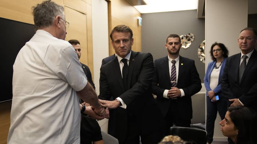 Eerder op de dag sprak hij al in Tel Aviv met Frans-Israëlische nabestaanden van slachtoffers. Sinds de aanval van Hamas op 7 oktober zijn dertig Franse staatsburgers omgekomen. Nog eens negen personen worden vermist. Van een aantal van hen is bekend dat ze in handen zijn van Hamas, melden de Franse autoriteiten