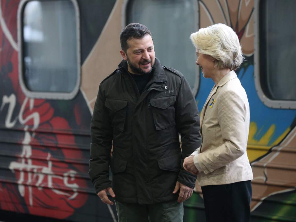 EC-voorzitter Ursula von der Leyen wordt begroet door de Oekraïense president Volodymyr Zelensky. | Beeld: Getty ImagesNieuwe sancties tegen Rusland