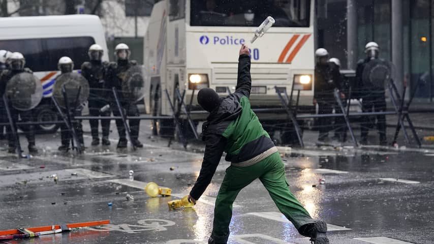 Sommige protesterende boeren gooiden onder meer met flessen, eieren, vuurwerk en dranghekken naar de politie. | Beeld: Getty Images
