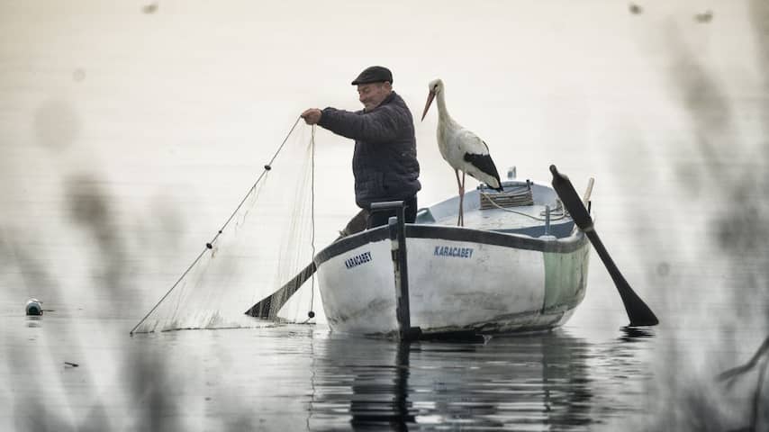 De ooievaar vaart geregeld met Adem Yilmaz mee op het Uluabatmeer. | Beeld: Getty Images