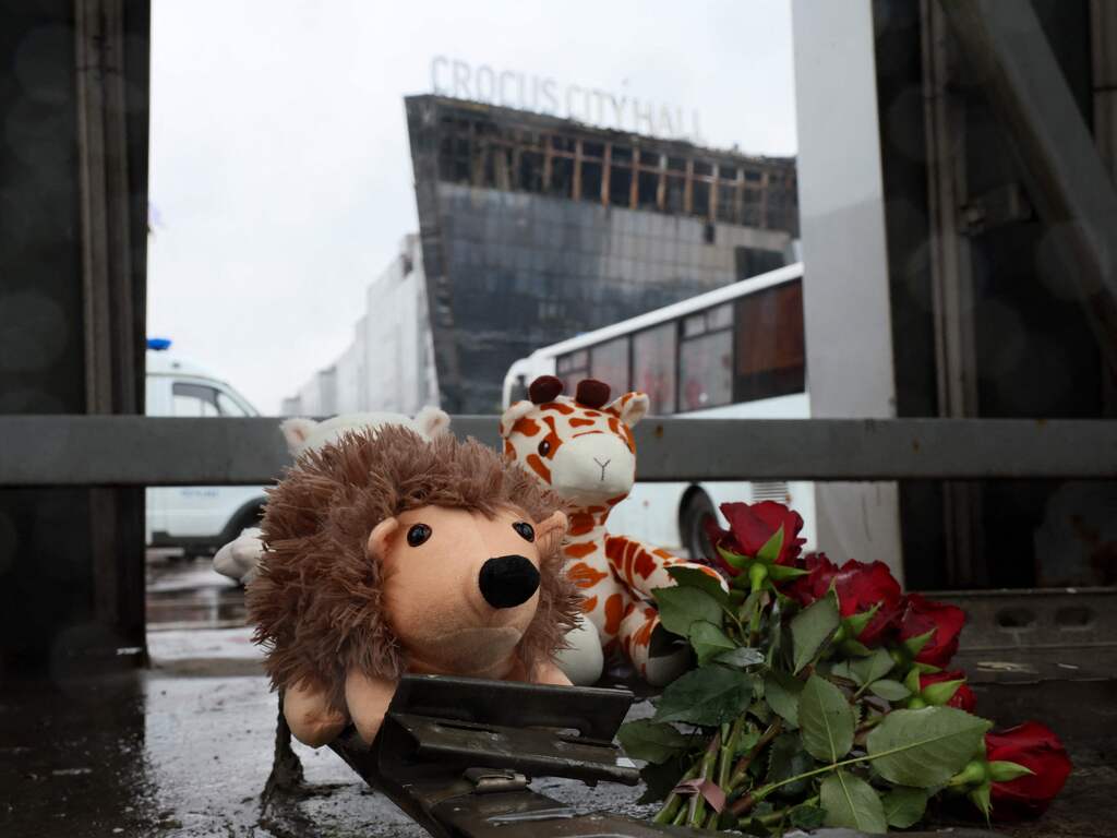 Vlak bij de plek van de aanslag worden bloemen en knuffels neergelegd. Rusland rouwt om de ruim honderd doden en vele gewonden.