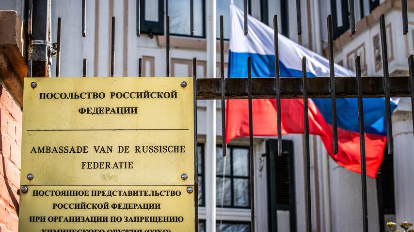 Bij Russische ambassades hangt de vlag halfstok, zo ook in Den Haag.