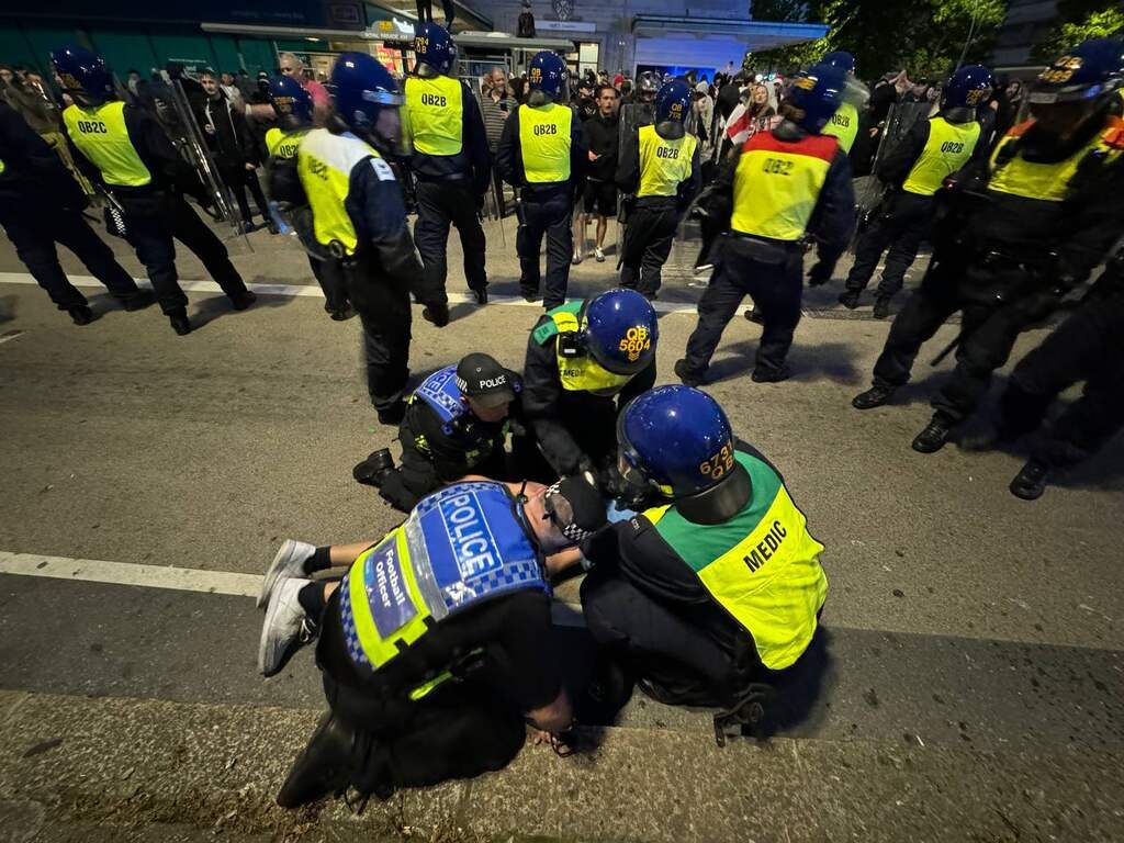 Sky News meldt dat er met rookbommen, vuurwerk en andere voorwerpen werd gegooid tussen de twee demonstrerende groepen. Volgens een Sky News-verslaggever ter plaatse bleven de demonstranten van Stand Up to Racism op de aangewezen plek staan, terwijl extreemrechtse relschoppers door de politielinie heen probeerden te breken. Bij zo'n poging zou er een opstootje zijn geweest tussen relschoppers en agenten, waarbij zeker drie agenten gewond raakten.
