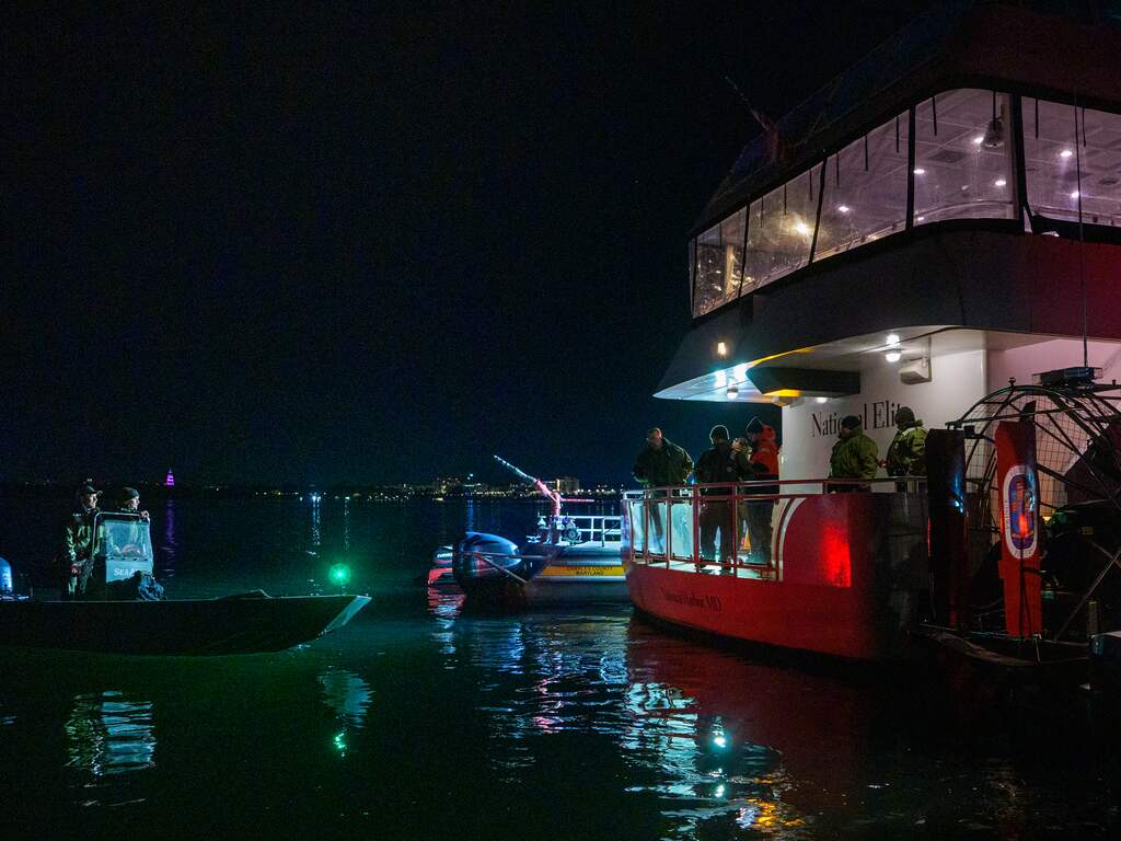 De hulpdiensten gebruiken een commercieel passagiersschip aan de kade als commandocentrum voor de reddingsactie op de Potomac-rivier.