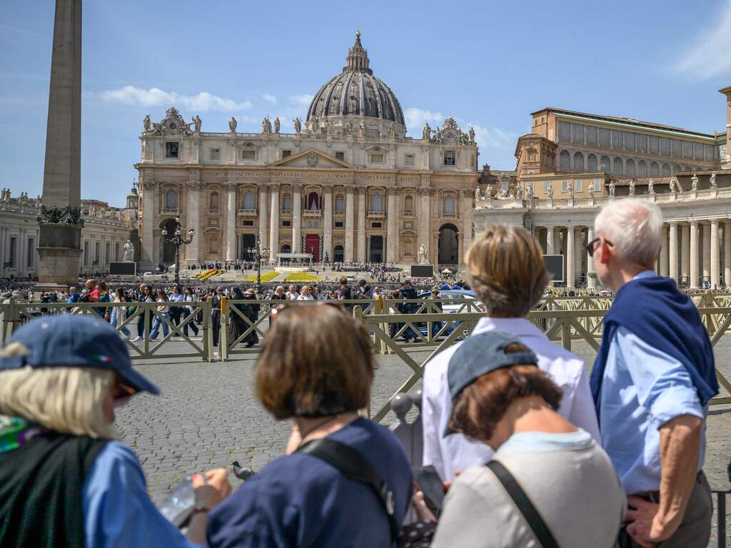 Gedurende de dag wordt het steeds drukker op het Sint-Pietersplein in Vaticaanstad. Mensen komen massaal bijeen om te rouwen om de dood van Franciscus. | Beeld: Getty Images