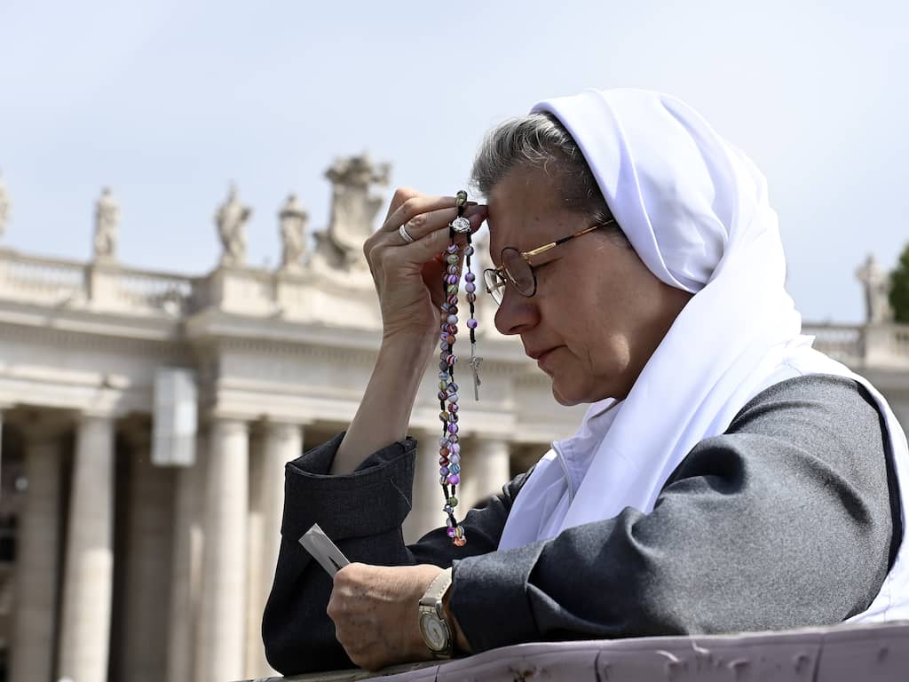 Een non slaat een kruisje voor de overleden paus. | Beeld: Getty Images