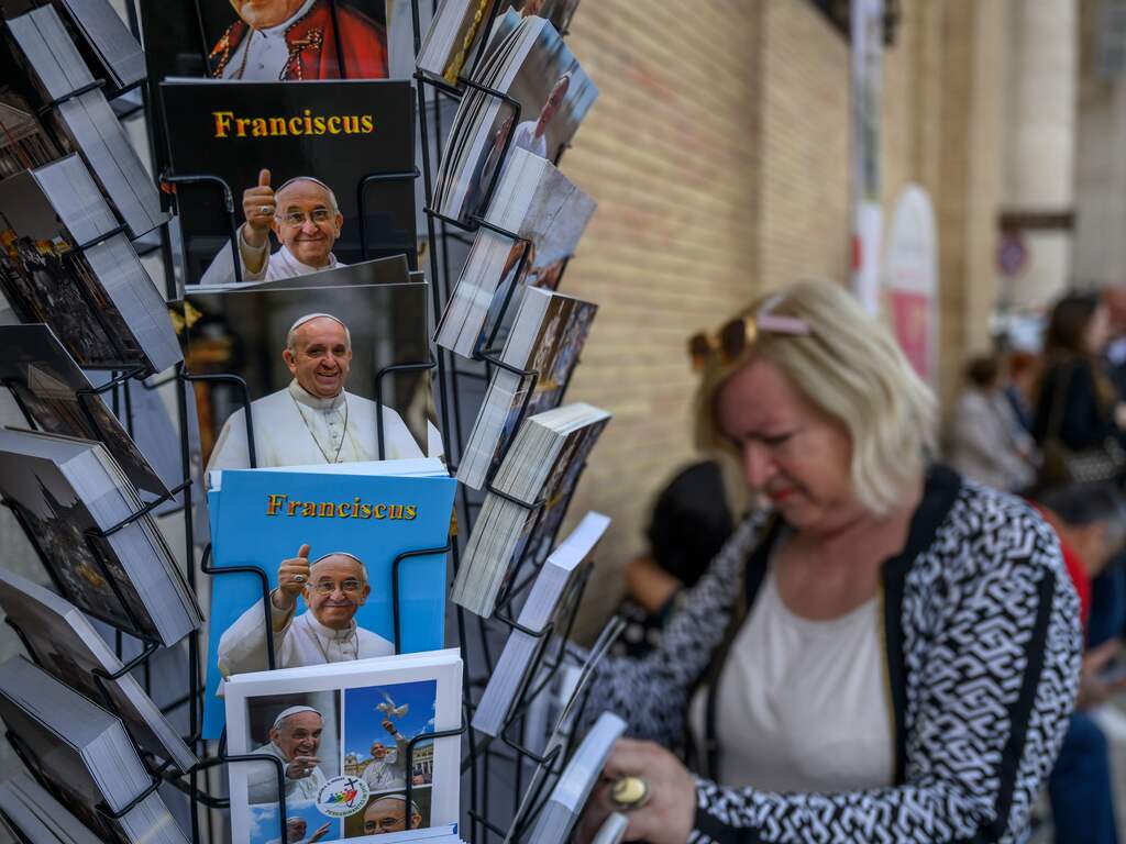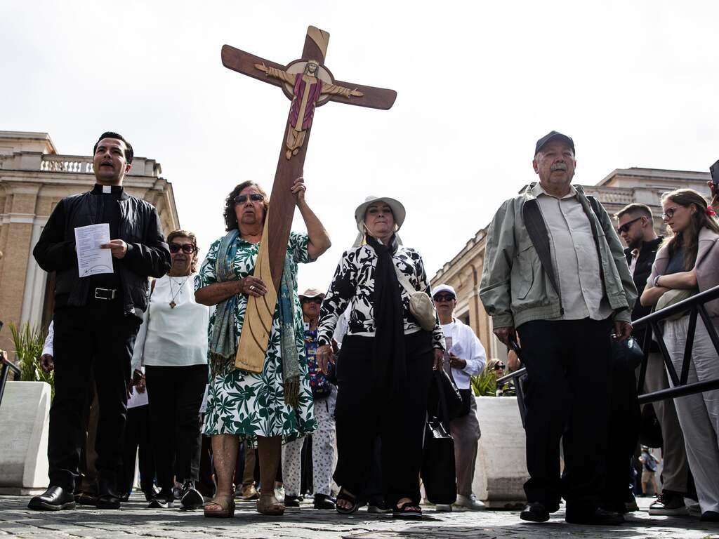 Gelovigen en pelgrims verzamelen onder meer op het plein om paus Franciscus een laatste eer te bewijzen. | Beeld: EPA