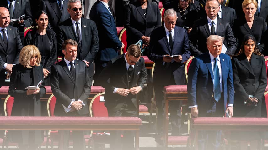 De Amerikaanse president Donald Trump en de Franse president Emmanuel Macron zaten samen met hun echtgenotes op de eerste rij tijdens de dienst. | Beeld: BrunoPress