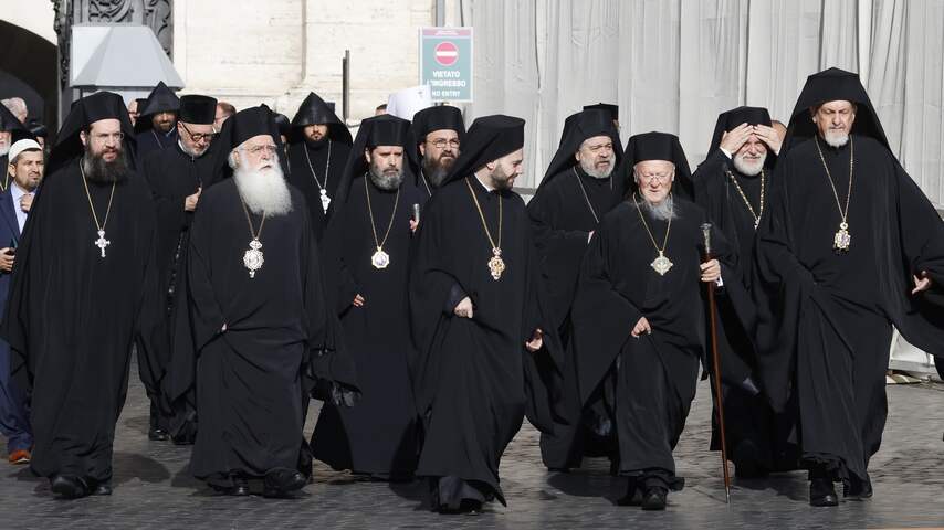 Orthodoxe christelijke priesters arriveerden donderdag al bij het Vaticaan. De afgelopen week stroomde het stadstaatje vol met belangstellenden. | Beeld: Getty Images