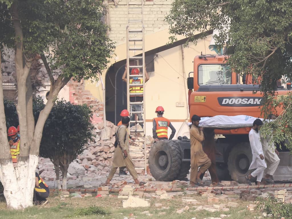 Het lichaam van een slachtoffer wordt weggedragen bij een getroffen gebouw in de Pakistaanse stad Muridke.