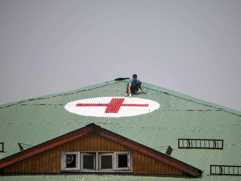 Een Indiase man neemt maatregelen tegen de toenemende dreiging. Hij beschildert het dak zodat duidelijk te zien is dat het een ziekenhuis betreft.