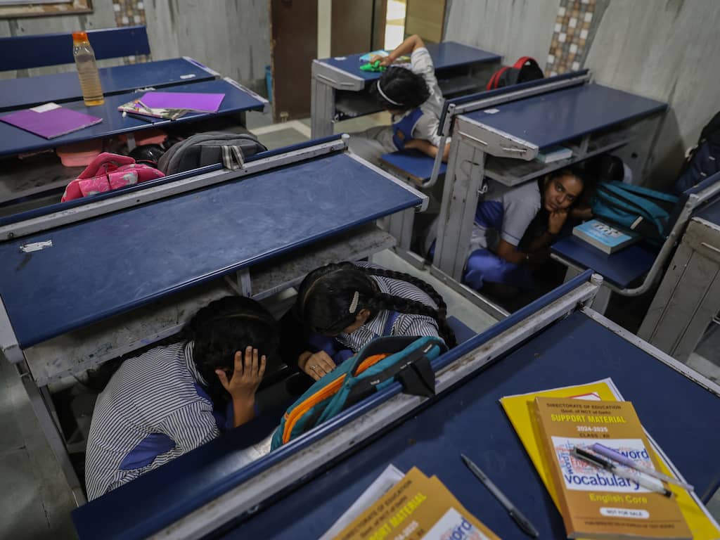 Indiase schoolkinderen verschuilen zich onder hun tafel tijdens een landelijke veiligheidsoefening. Hulpdiensten, instellingen en scholen door heel India oefenen vandaag wat ze moeten doen bij een crisis.
