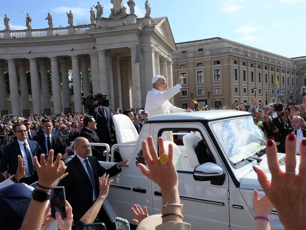 Paus Leo XIV komt naar buiten en verschijnt op het Sint-Pietersplein, dat volledig gevuld is.