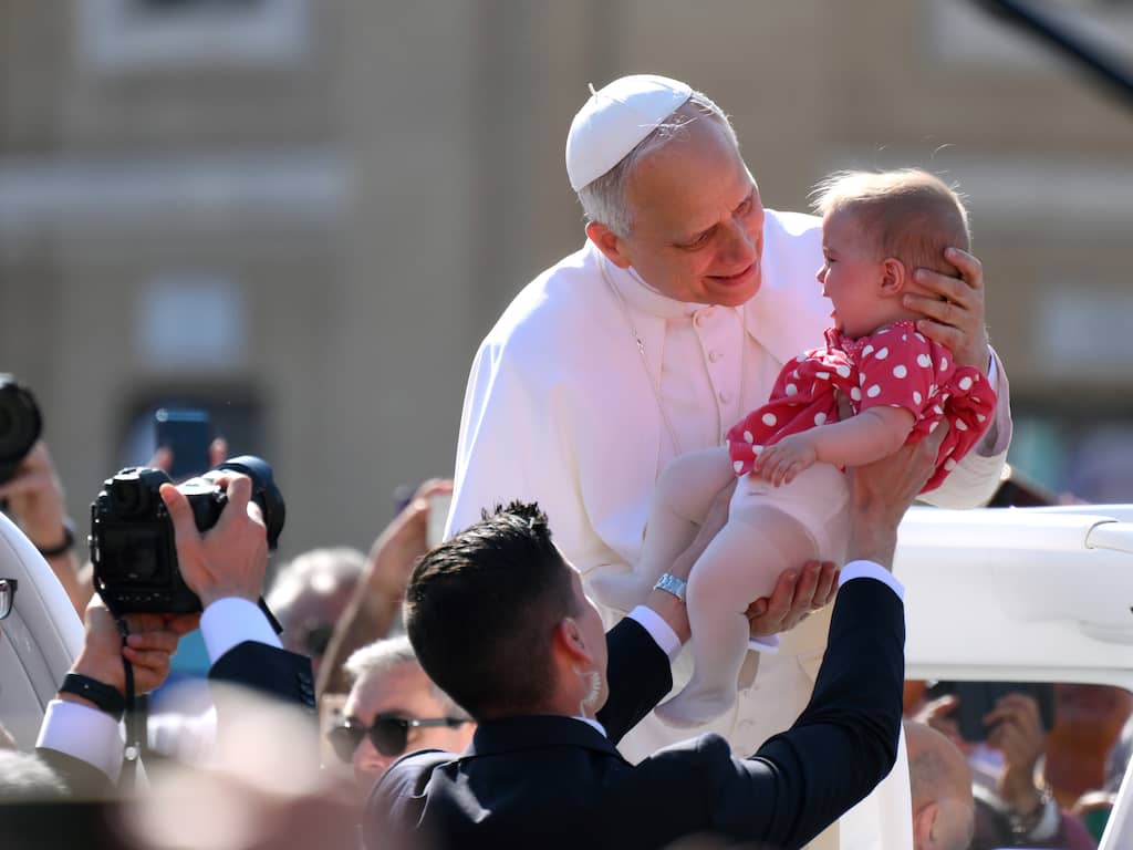 Paus Leo XIV houdt op zijn weg naar het Vaticaan een baby vast.