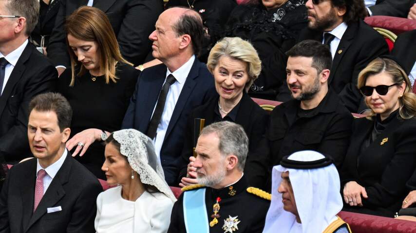 Ook de Oekraïense president Volodymyr Zelensky is aanwezig. Hij draagt een jasje. Dat is opvallend, want sinds de oorlog in zijn land uitbrak is Zelensky altijd in een legergroene of zwarte outfit gezien.