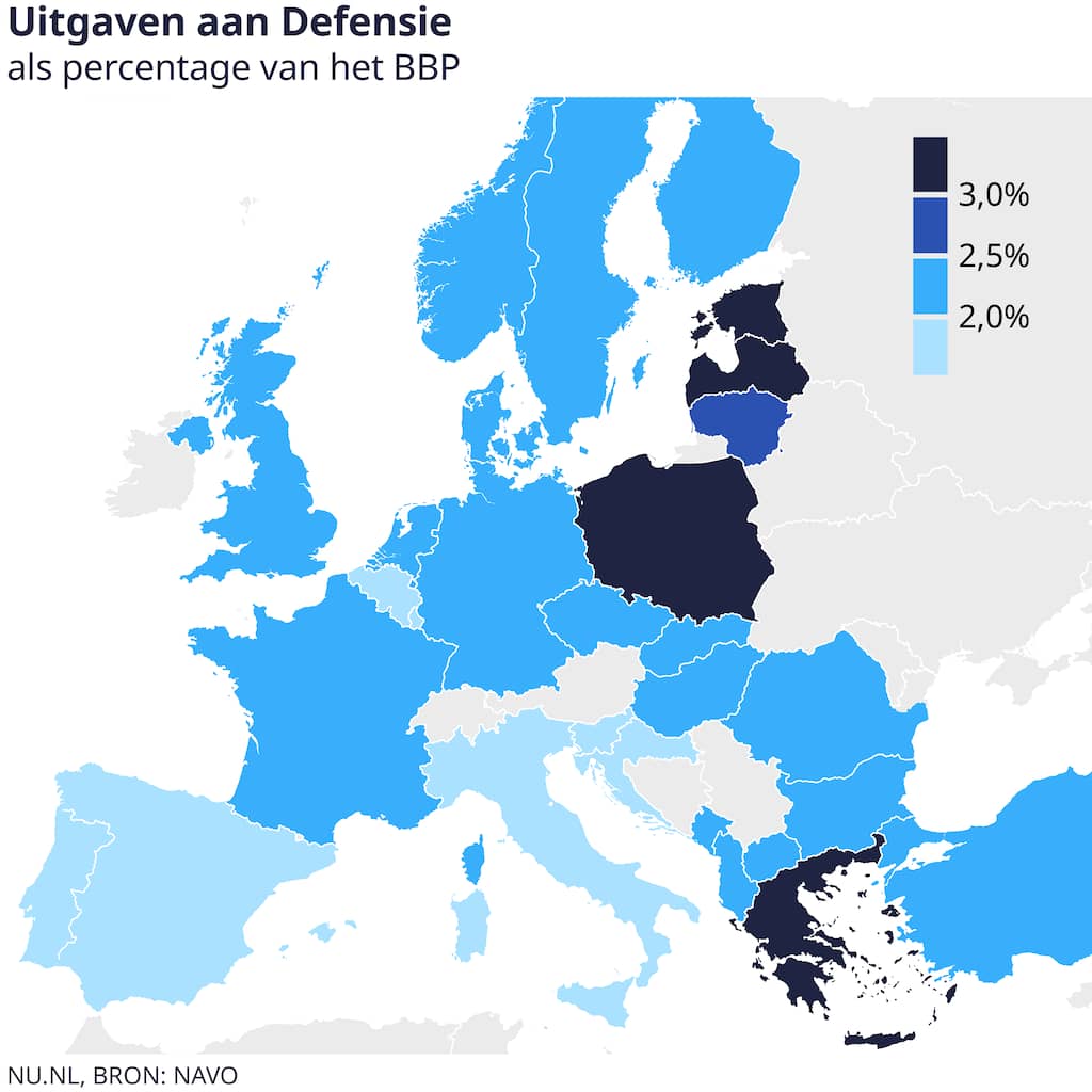 Veel bondgenoten steunen het plan, maar de lidstaten hebben nog geen definitieve knoop doorgehakt. Onderstaande kaart laat zien hoeveel NAVO-landen nu in defensie investeren.