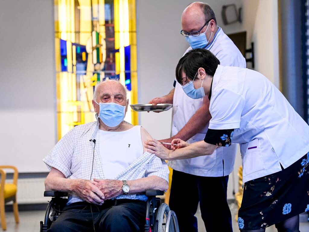 België is maandag als een van de laatste landen in de Europese Unie begonnen met het inenten van mensen tegen het coronavirus. De 96-jarige Jos Hermans in een woonzorgcentrum in Sint-Pieter in Puurs is de eerste Belg die is ingeënt.