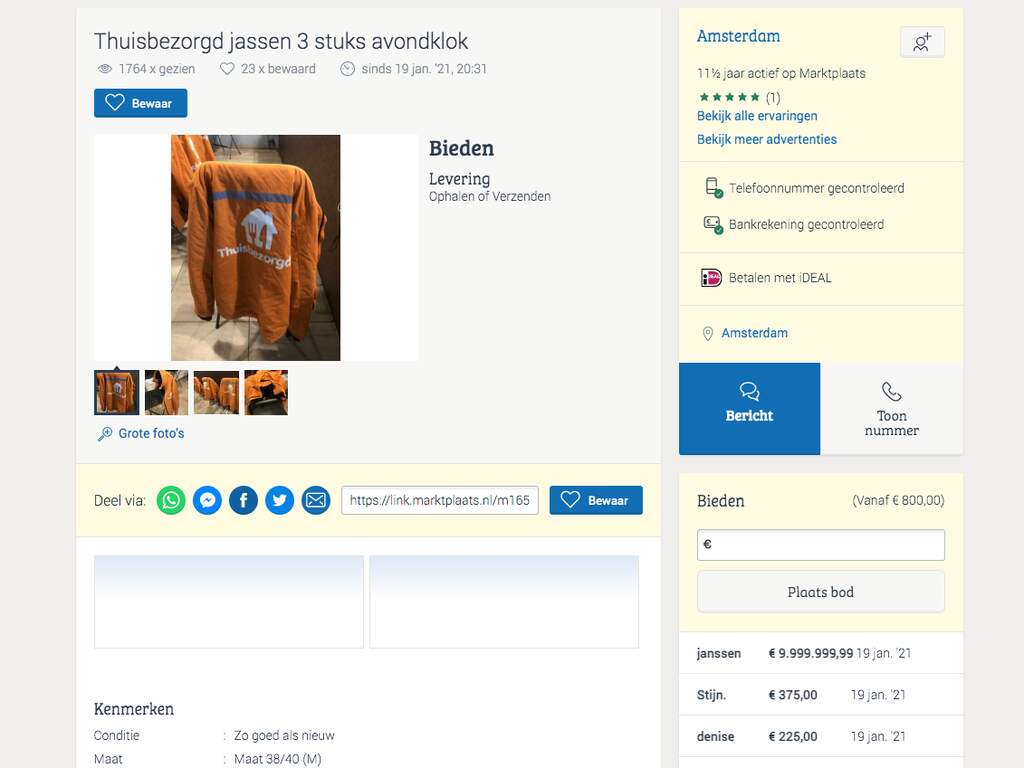 Naast leenhonden lijken ook jassen en tassen van bezorgdiensten zoals Thuisbezorgd populair. Op Marktplaats staan tientallen advertenties waar flink op geboden wordt. Moederbedrijf Justeat Takeaway is daar niet blij mee."We zijn al bezig om samen met Marktplaats alle advertenties te verwijderen", zegt directeur Jitse Groen tegen de NOS.