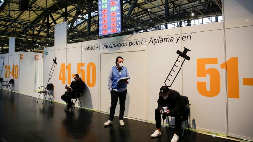 Een kijkje in de Duitse 'vaccinatiemachine': mensen wachten op hun beurt in een van de mega-inentingscentra die het land rijk is. | Beeld: ANPWedstrijdje prikken