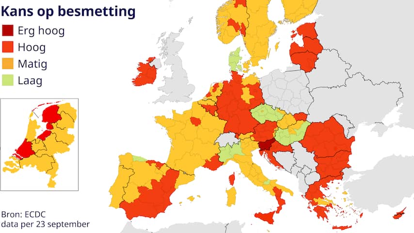 In de afgelopen drie weken stonden alle twaalf Nederlandse provincies op de een-na-hoogste waarschuwingskleur. Dat kwam doordat het algehele percentage positieve tests in de afgelopen twee weken boven de 5 procent lag. Het ECDC houdt voor mildere kleurcodes een positief percentage van beneden de 4 procent aan. In de afgelopen twee weken daalde het percentage positieve testen naar 3,8 procent.