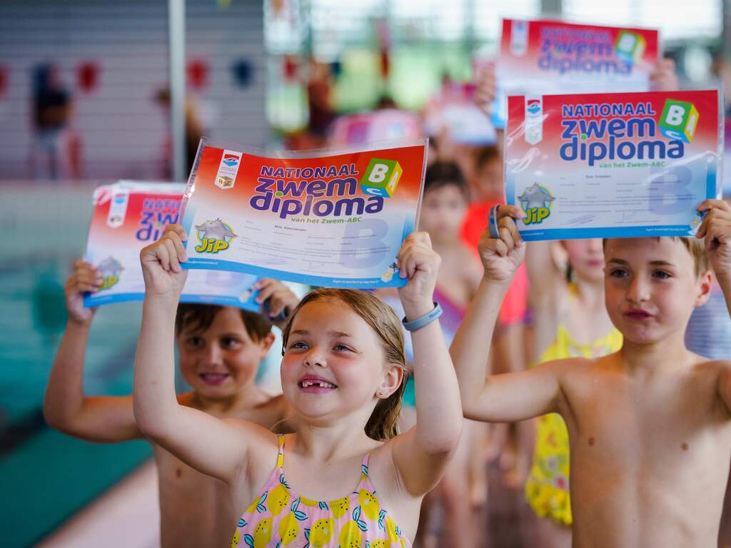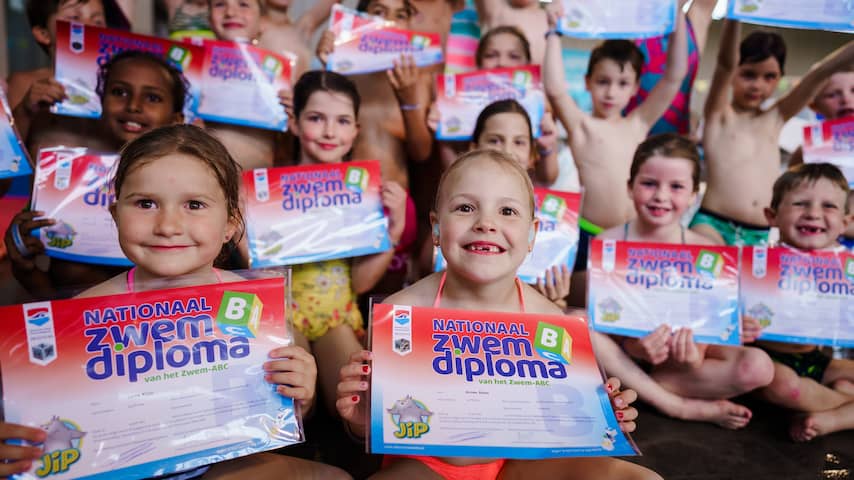 Kinderen tonen hun diploma na afloop van het afzwemmen. | Beeld: ANPMinister van Justitie komt terug op uitspraak over handhaving