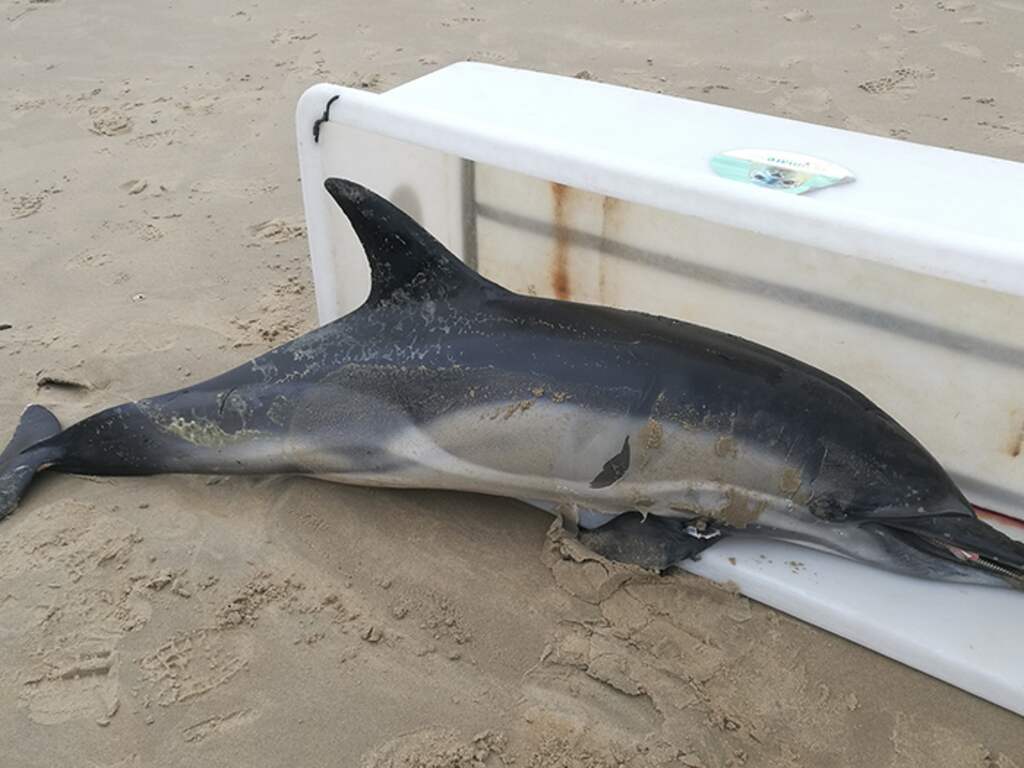 Een gewone dolfijn is dinsdag aangespoeld op het strand van Texel. Het dier was dood en werd gevonden door een dierenverzorger van Ecomare, een aquarium en zeehondenopvang op het Waddeneiland.
