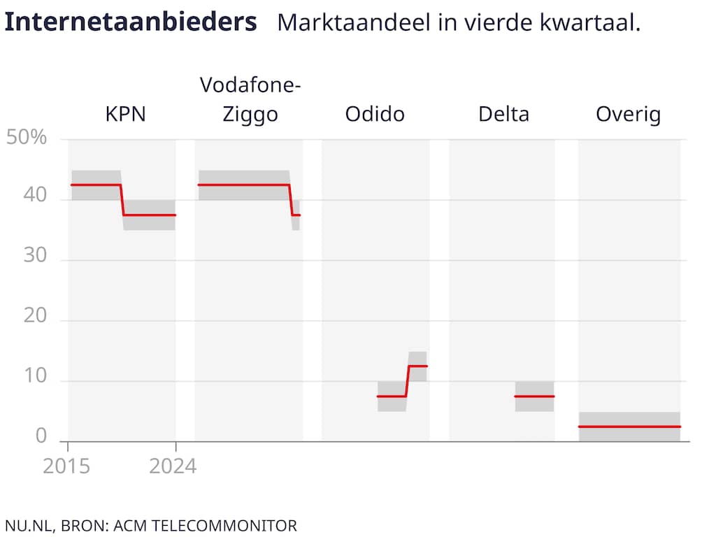 Dat KPN en Ziggo samen de markt voor internetaansluitingen verdelen is niet langer vanzelfsprekend. Het klantenbestand van Ziggo krimpt al jaren en KPN groeit alleen door overnames. Odido en Delta zijn de lachende derde.