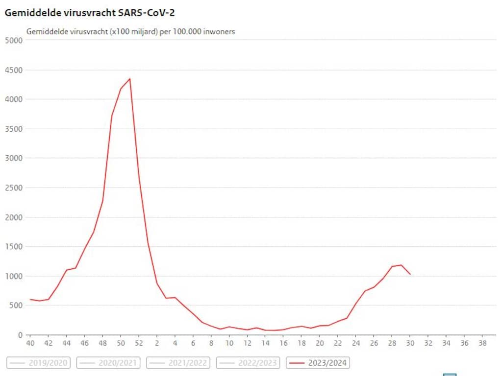 De zogenoemde virusvracht is volgens het instituut met 13 procent gedaald ten opzichte van de week ervoor. Het is de eerste daling sinds begin mei. De week daarvoor was er nog sprake van een heel lichte stijging.