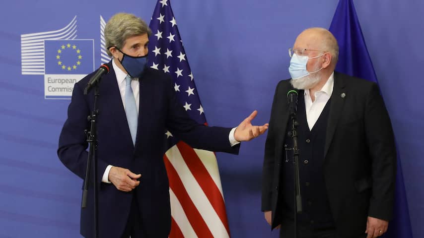 Amerikaanse klimaatgezant John Kerry en Frans Timmermans in Brussel. | Beeld: ANP"Daar moeten de beloften die in 2015 in Parijs zijn gemaakt, worden ingelost. Onderhandelaars stonden toen met tranen in de ogen, de champagne vloeide, maar het waren niet meer dan beloften die daar werden gemaakt. Maar hoe gaan we het bereiken? Wat er tot nu toe op tafel lag, was niet ambitieus genoeg om onder de afgesproken twee graden of liever anderhalve graad te blijven. Wat we nu als Europese Unie hebben gepresenteerd, is onze inzet voor Glasgow. En we willen de rest meenemen. Frans Timmermans reist momenteel de wereld rond, zodat zij ook met plannen komen."