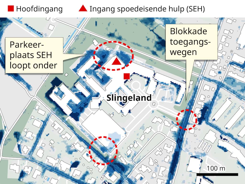 Bijna een kwart van de afdelingen spoedeisende hulp in Nederland wordt onbereikbaar bij een zeer zware regenbui. Toegangswegen worden door diepe plassen onbegaanbaar of er komt water het ziekenhuis binnen. Mensen die acute zorg nodig hebben kunnen dan in gevaar komen, waarschuwen experts.