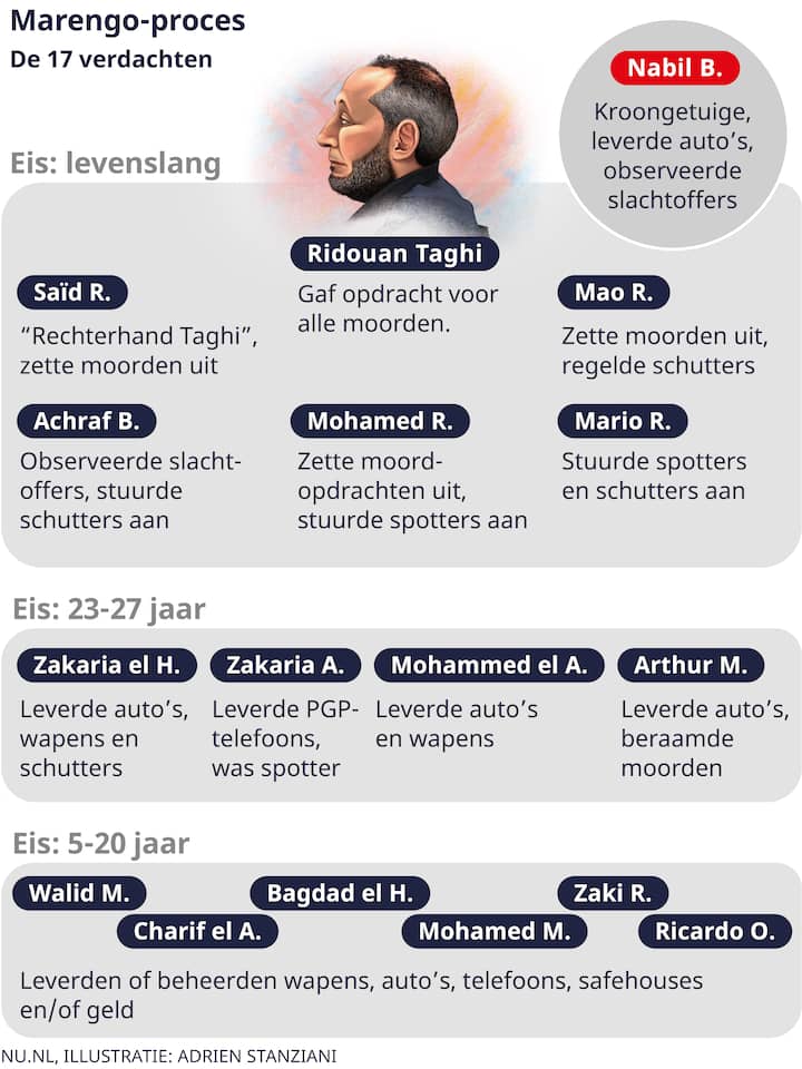 Aan het hoofd van de criminele organisatie stond volgens het OM Ridouan Taghi. De 46-jarige man die eind 2019 werd aangehouden en er vaker niet dan wel was tijdens het Marengo-proces. Taghi heeft altijd het gevoel gehad dat al vaststond dat hij levenslang zou krijgen, dus wat had het voor zin om te komen opdagen?