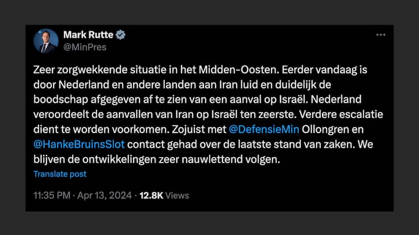 "Ik heb besloten de Iraanse ambassadeur in Den Haag te ontbieden om onze veroordeling over de gevaarlijke Iraanse aanval op Israël afgelopen nacht over te brengen."